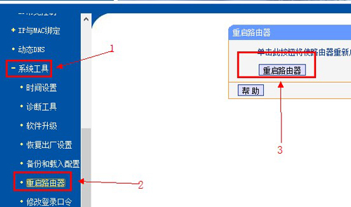 5、重启路由器。左侧导航栏,点击【系统设置】,然后点击【重启路由器按钮】,待重启好后就生效了。